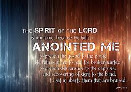“The Spirit of the Lord God is upon me, because the Lord has anointed me to bring good news to the afflicted [poor]. He has sent me to bind up the brokenhearted, to proclaim liberty to captives and freedom to prisoners; [Luke adds, and recovery of sight for the blind, to release the oppressed], to proclaim the favorable year of the Lord.”